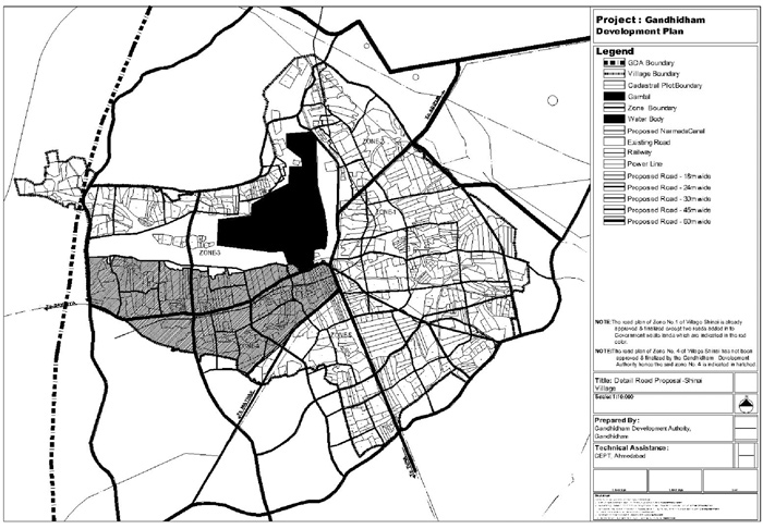 NOTE: The road plan of Zone No. 4 of Village Shinai has not been approved & finalized by the Gandhidham Development Authority hence the said zone No. 4 is indicated in hatched.